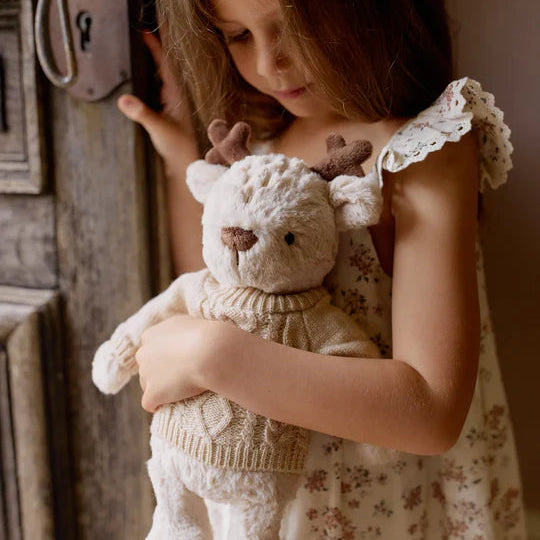 Douce et attachante avec son joli chandail en tricot, la peluche Fable le cerf deviendra rapidement le compagnon préféré de votre enfant!