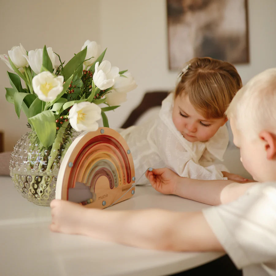 Add a splash of color to playtime with our Wooden Magnetic Rainbow Maze. Using the attached magnetic pen, littles can guide each colorful bead along the pathways, matching them to their corresponding arches while refining fine motor skills and hand-eye coordination. With its timeless design and engaging, screen-free play, this toy is a delightful blend of learning and fun.
