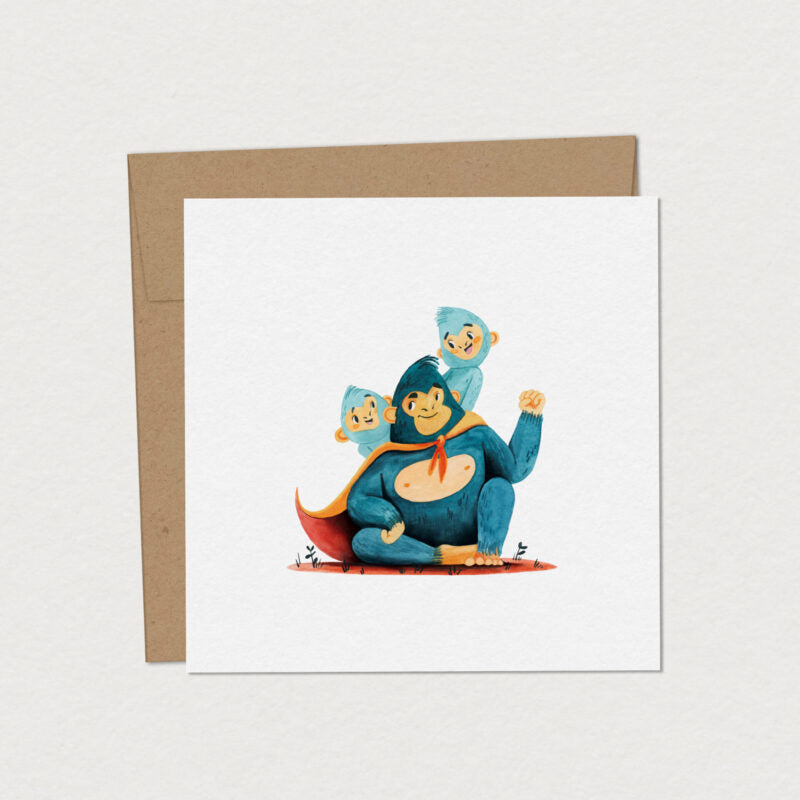 Découvrez notre carte de souhaits Papa Gorilla, une illustration touchante d’un père gorille et ses enfants. Capturant la force et la tendresse de la relation parent-enfant, cette carte est parfaite pour célébrer les papas avec une touche de nature sauvage.